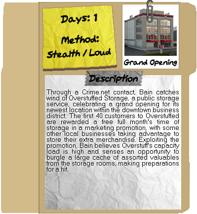 Crime.net is compromised; the identities of several members unveiled, including Dallas. While Bain scrambles to pinpoint and patch the information leak, Dallas' offshore account and spending cash linked through Crime.net, are rendered frozen and unavailable until further notice, until Crime.net recovers from lockdown mode. The unthinkable has happened: Dallas needs to find a regular job once more, as resorting to petty theft is not worthwhile the risk and his avenues to organize heists are severed. Despite the unpleasantness and menial work that may await him, Dallas must learn to adjust and wean himself off Crime.net.